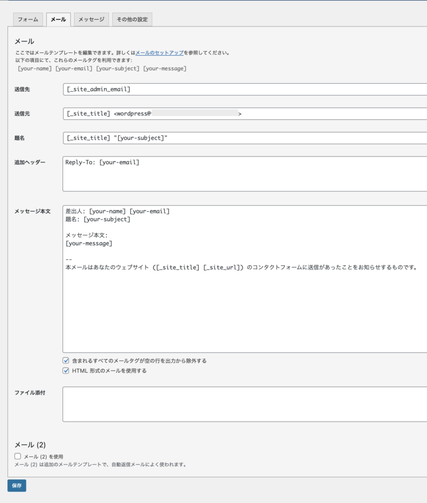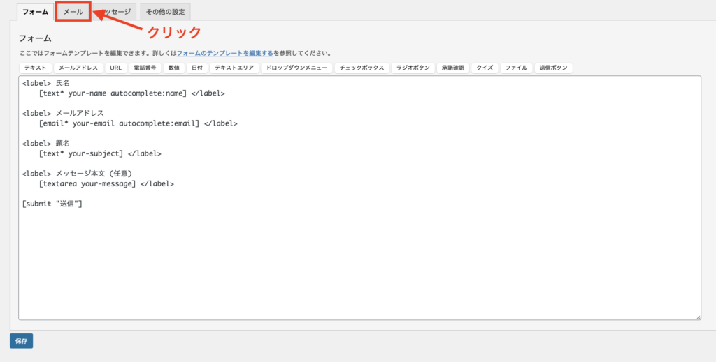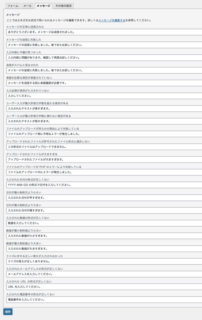 最初に開いている「フォーム」タブでは、お問い合わせフォームの入力項目(名前・メール・メッセージなど)を編集できます。