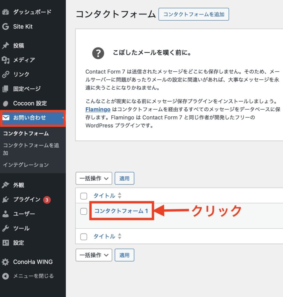 WordPress管理画面の左メニューから、「お問い合わせ」→「コンタクトフォーム1」をクリックしましょう。