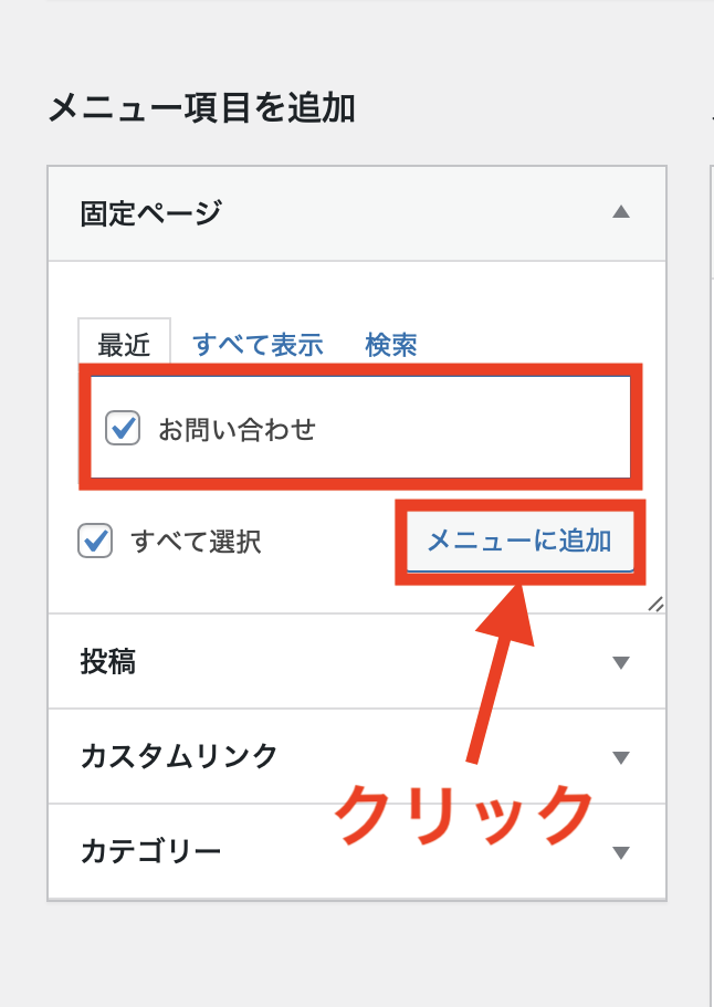 「お問い合わせ」にチェックを入れて、「メニューに追加」をクリックしましょう。