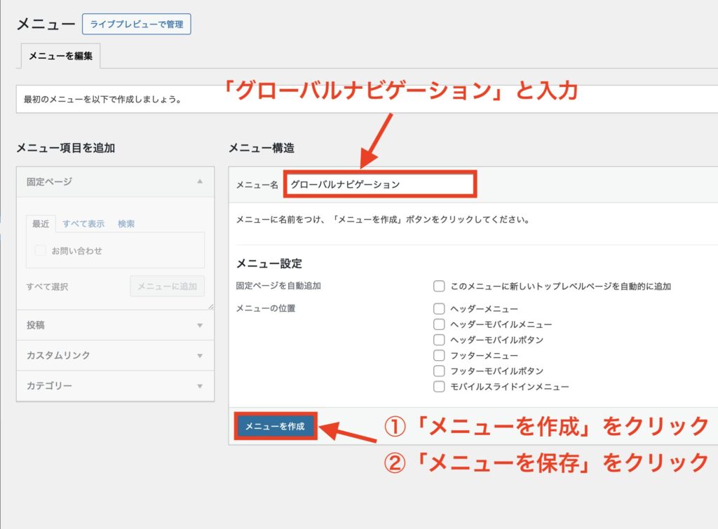 メニュー名に「グローバルナビゲーション」と入力し、「メニューを作成」「メニューを保存」をクリックします。(メニュー名は「ヘッダー」でもOKです。)