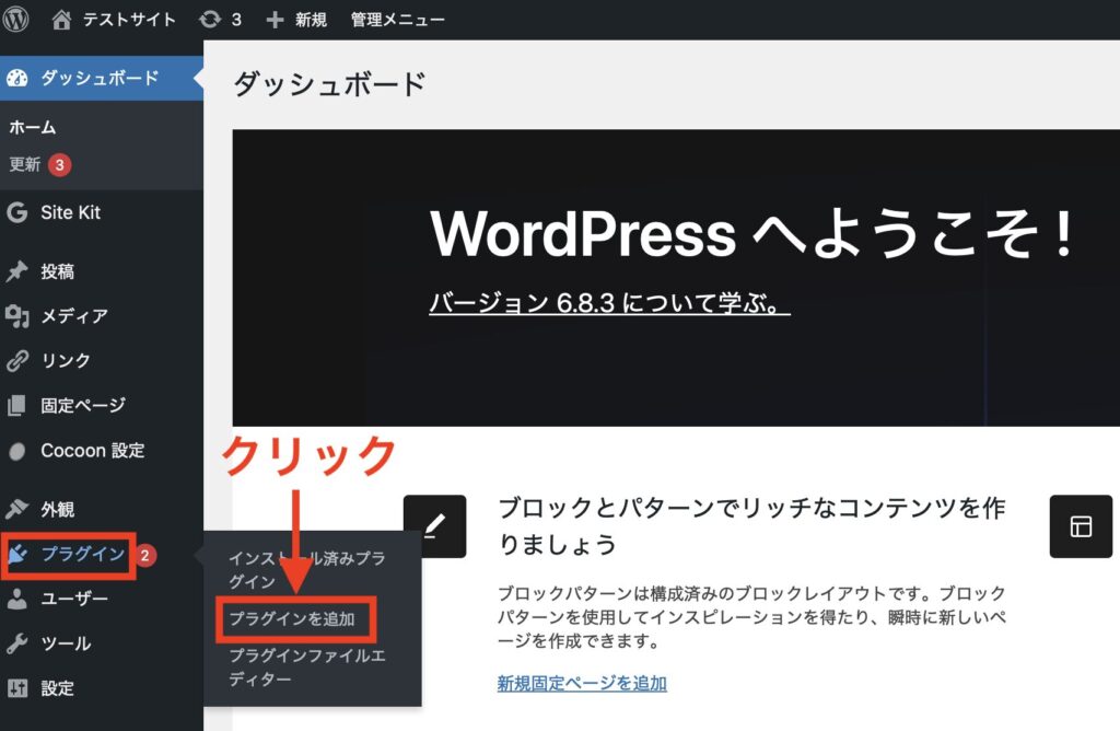WordPress管理画面の左メニューから「プラグインを追加」をクリックしましょう。