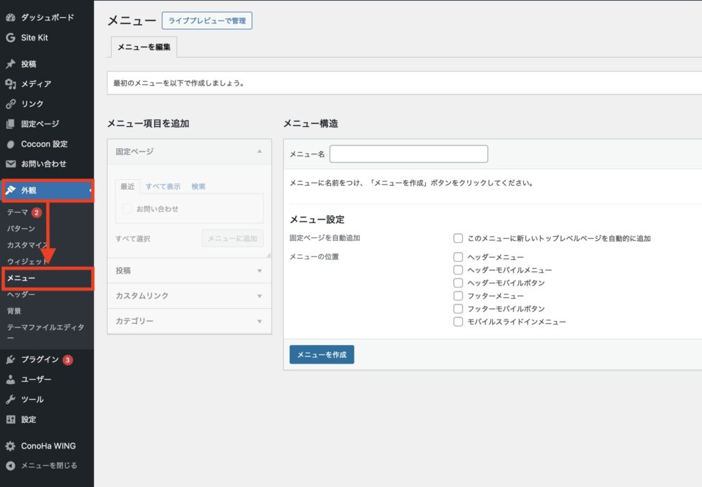 管理画面から「外観」→「メニュー」をクリック