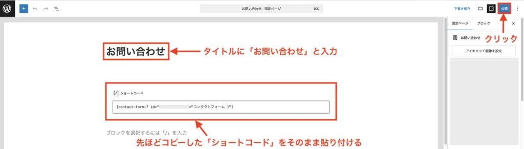 固定ページの編集画面になりますので、タイトルに「お問い合わせ」と入力し、本文に「ショートコード」をそのまま貼り付けましょう。