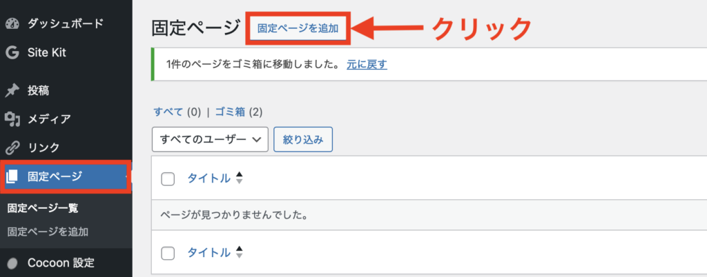 WordPress左メニューの「固定ページ」「固定ページを追加」をクリックします。