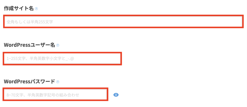 - WordPressパスワード:「パスワード」を入力
