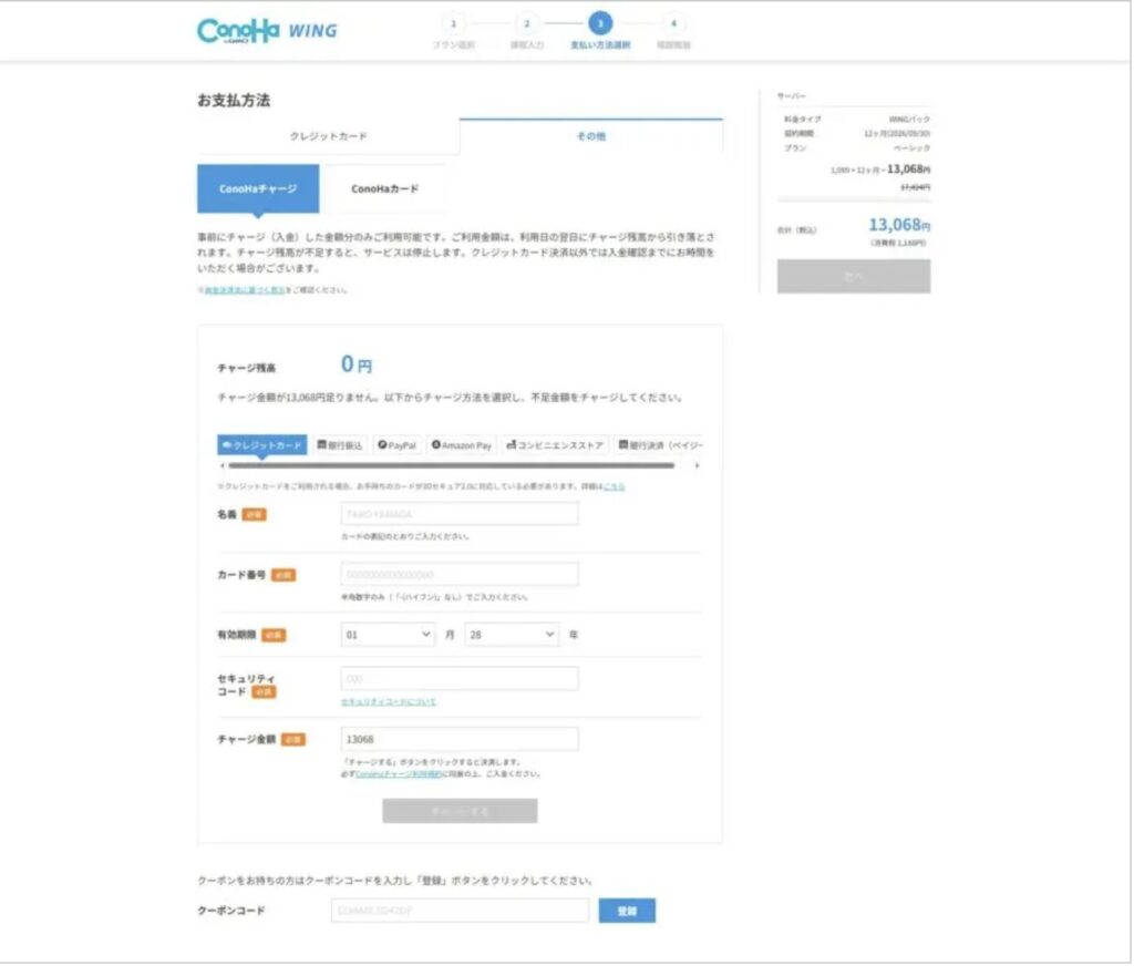 - ConoHaチャージ:クレジットカード、銀行振込、Amazon Pay、コンビニ、銀行決済(ペイジー)、paypalが選択できます。