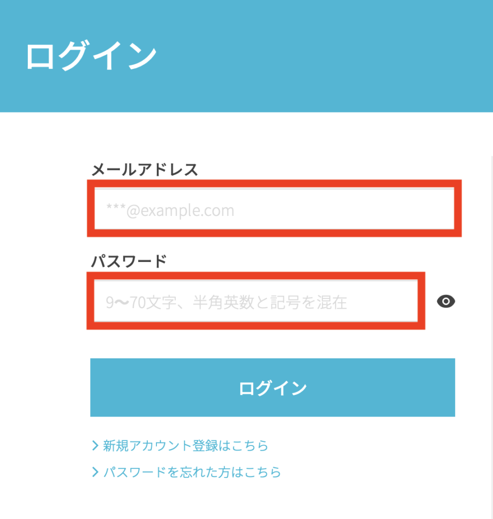 アカウント情報は、「メールアドレス」と「パスワード」を入力していきましょう。