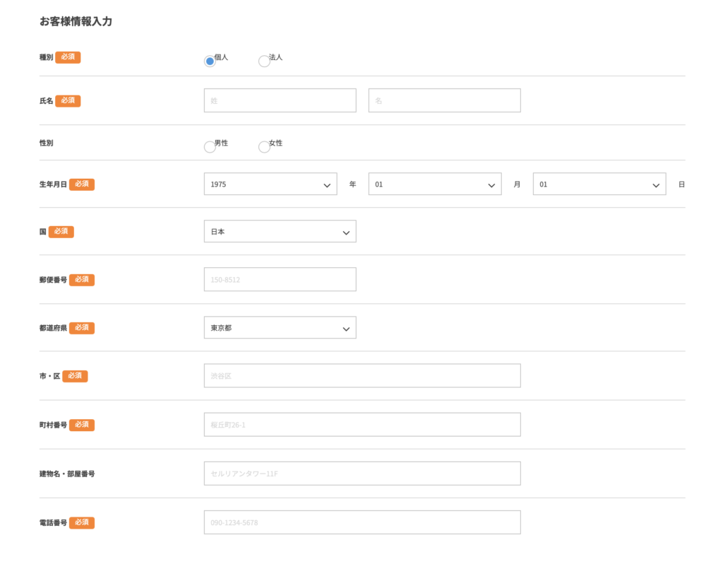 お客様情報は、氏名や住所などを入力していきます。