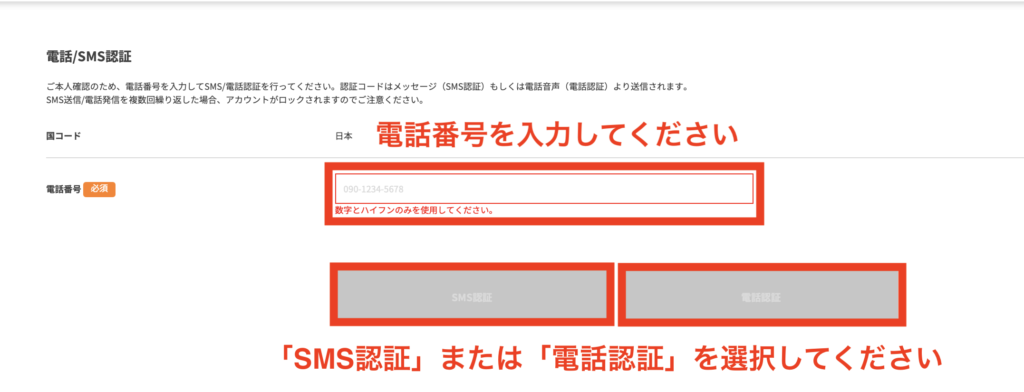 電話番号を入力して、「SMS認証」または「電話認証」をクリックしましょう。(SMS認証が簡単です)