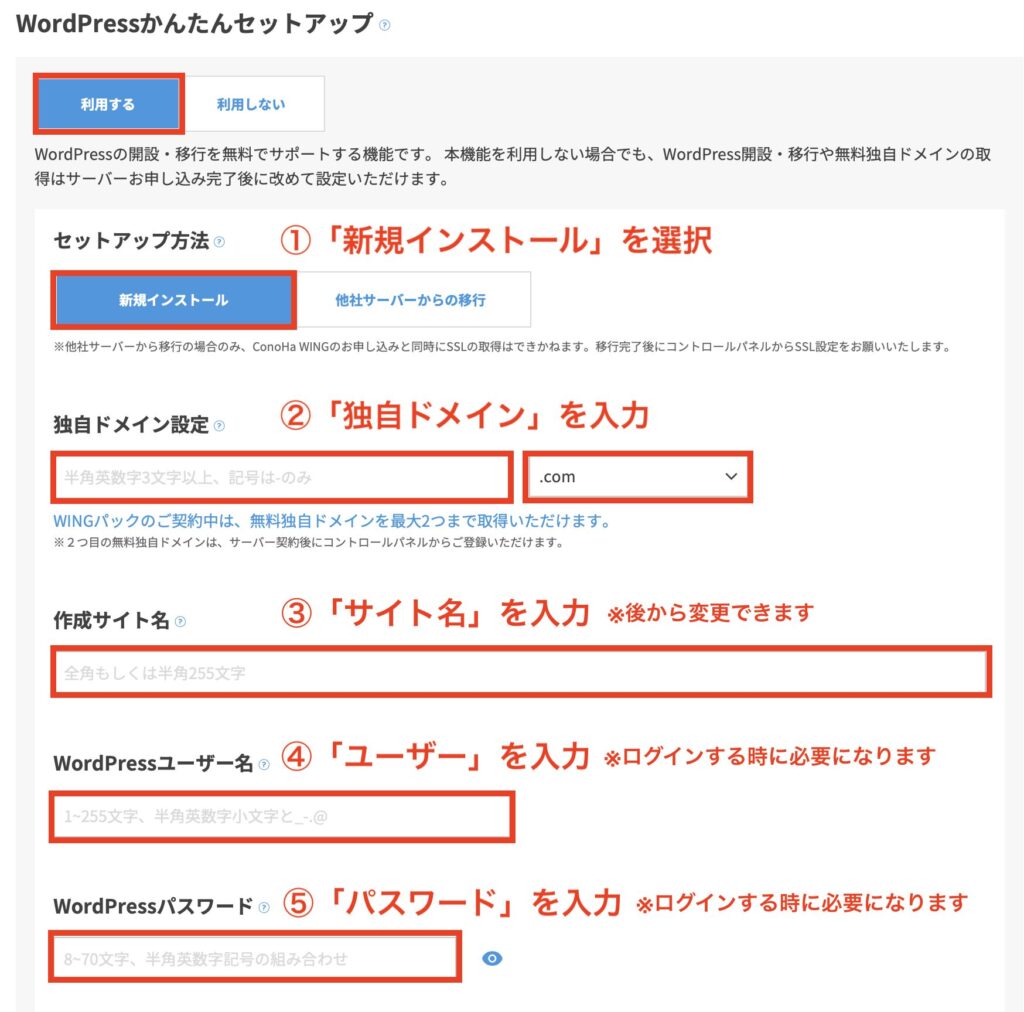 - ユーザー名:WordPressにログインする時に毎回使います(必ずメモかスクショを取ってください)