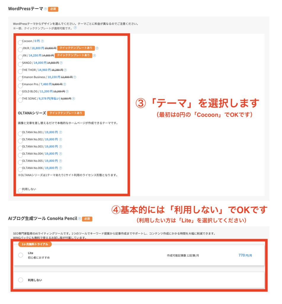 - AIブログ生成ツールConoHa Pencil:基本的には「利用しない」でOKです。使いたい方は「Lite」を選択してください。