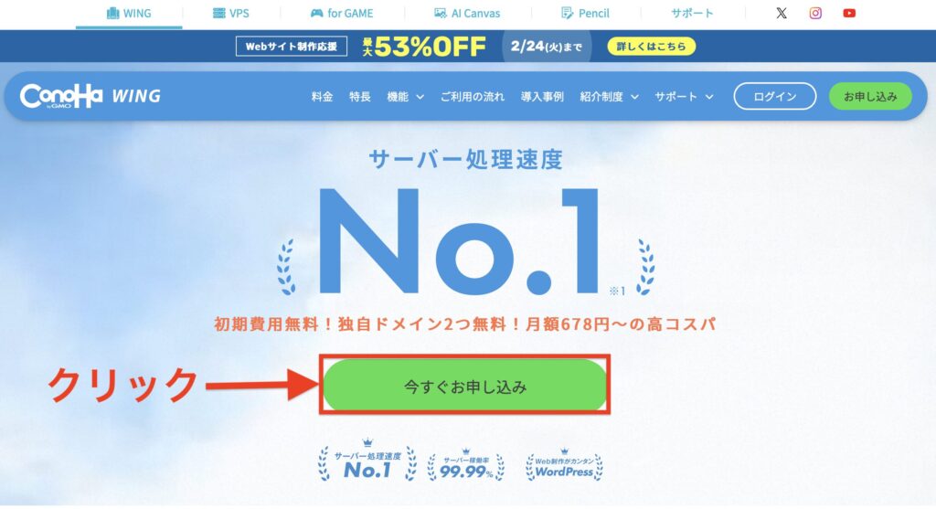 まずは、ConoHa WINGの公式ページにアクセスします。