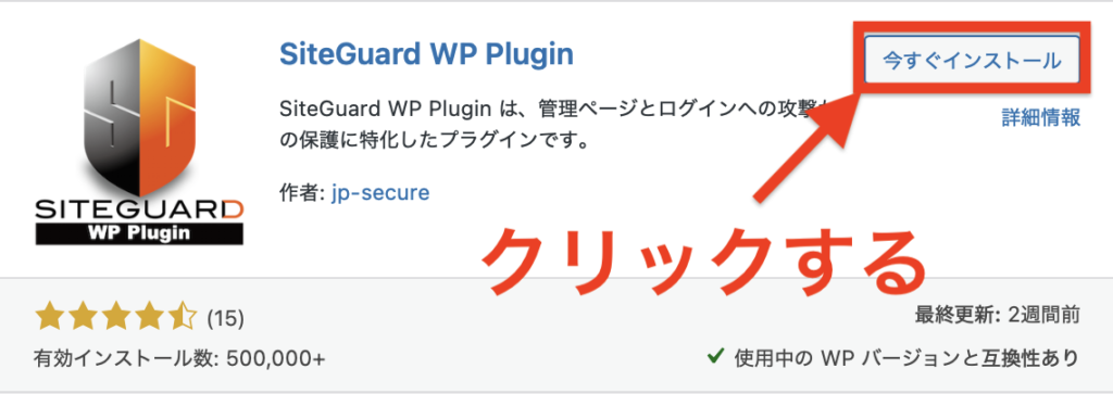 SiteGuard WP Pluginを「今すぐインストール」して、「有効化」をクリックしましょう。
