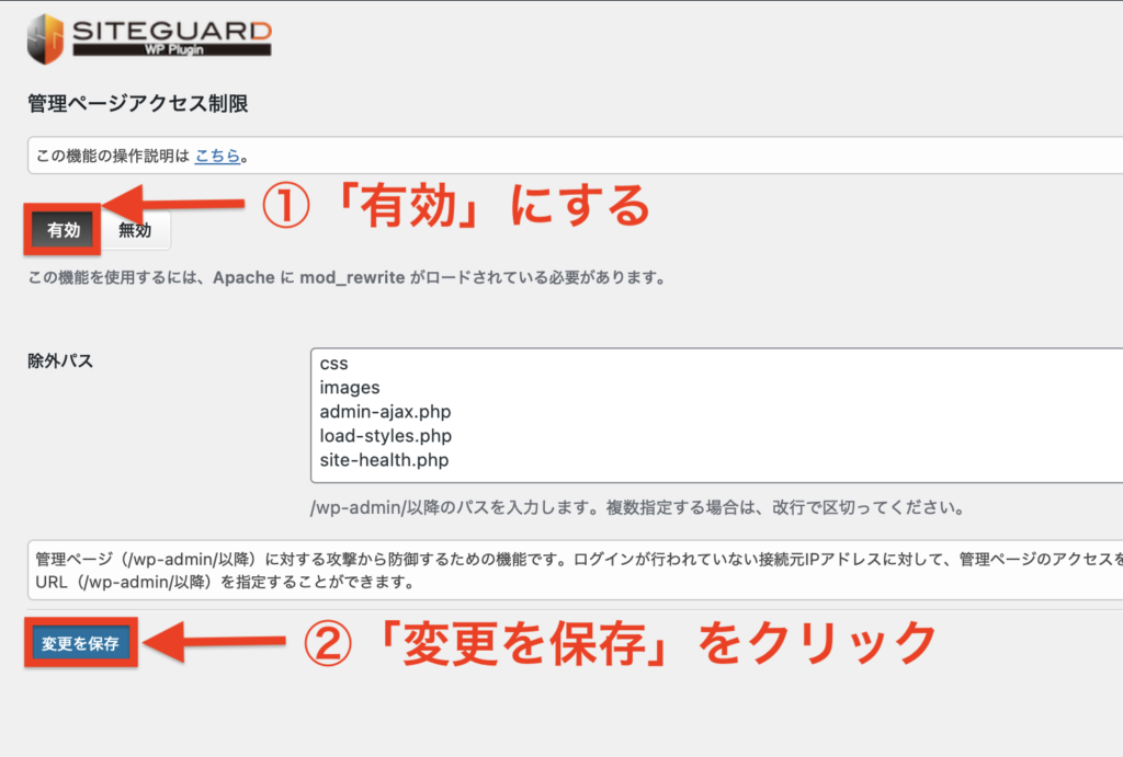管理ページアクセス制限を「有効」にして、「変更を保存」をクリックしましょう。