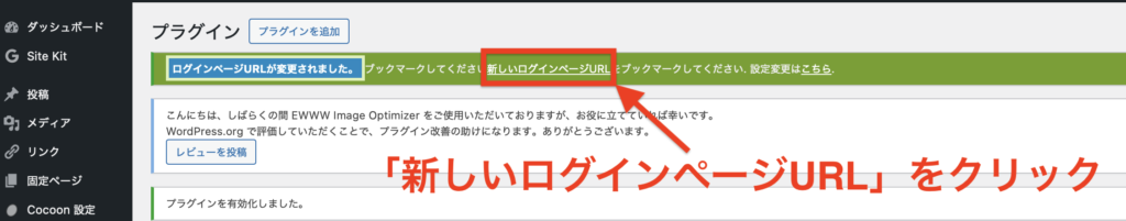 管理画面の上部に表示された、「新しいログインページURL」をクリックします。
