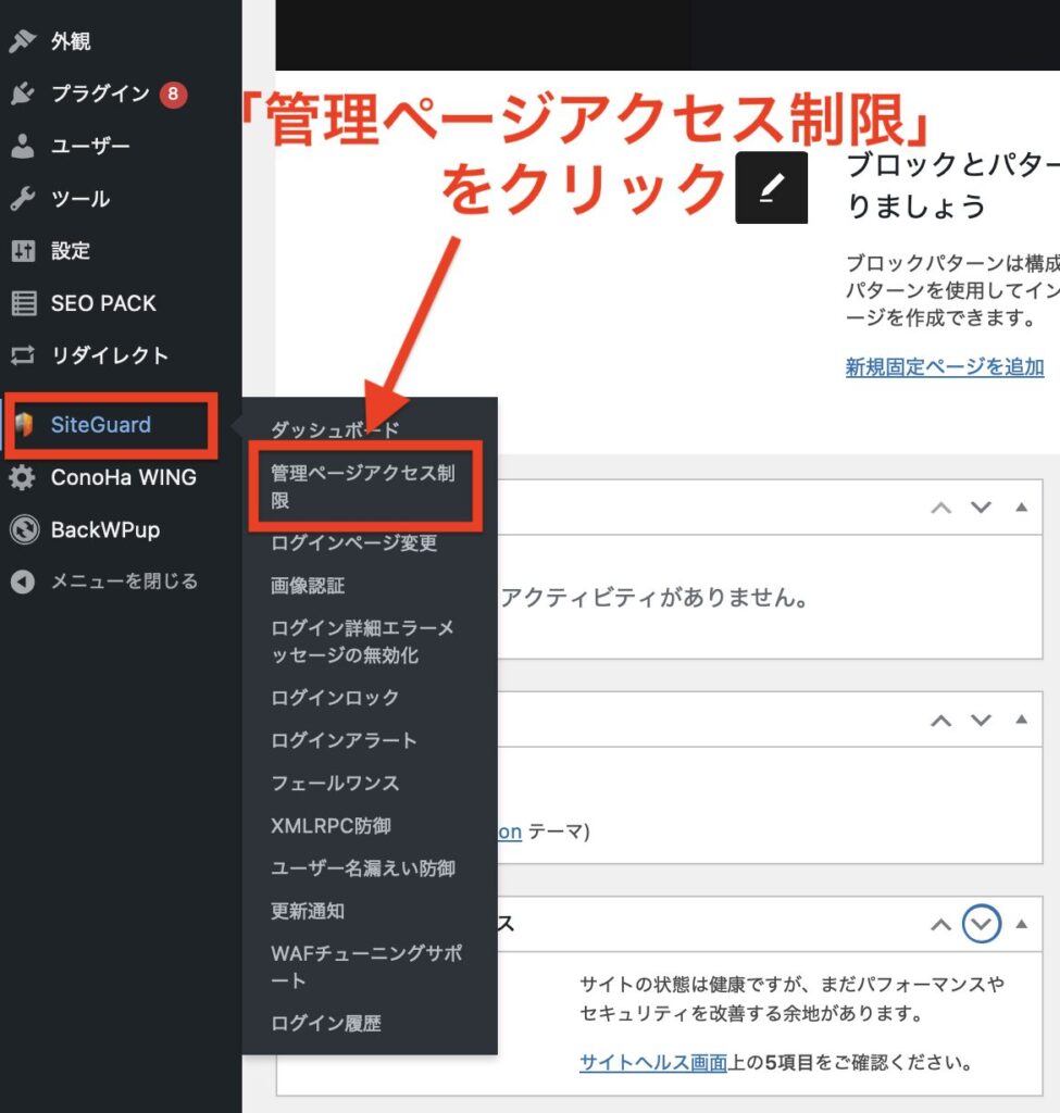 WordPress管理画面の左メニューから「SiteGuard」→「管理ページアクセス制限」をクリックしましょう。