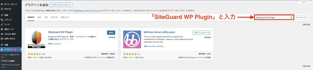 右上の検索バーに「SiteGuard WP Plugin」と入力します。