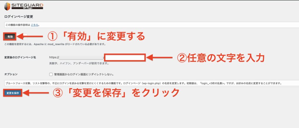 「SiteGuard WP Plugin」を有効化すると、自分専用の「新しいログインページURL」が自動的に作成されます。