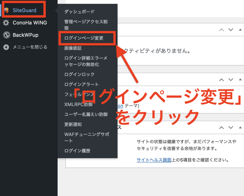 WordPress管理画面の左メニューから「SiteGuard」→「ログインページ変更」をクリックします。